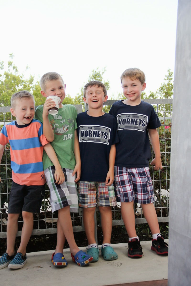 Britt is such a tender kid. He hardly makes a peep, but when he gets to talking he can go for days. We thought a small outing would be more fun for him than a big party. We gathered the 1st grade boys on the street, 2 of which happen to be in his class at school too, & I took them out to Britt's favorite burger joint. Those boys were hilarious! They are all such good buddies. They all have such big hearts! On the way to & from dinner they took turns adding to a story. They chatted like I wasn't there...so I got a good idea on what 1st grade boys think about. Mostly mine craft & bikes. I loved watching Britton interact with his buddies. I think of all my little guys I worry most about Britton. He lives his life in a world of drawings & block creations. He is our dreamer. I love that about him. His stories and ideas are grand. Taking him out with friends eased those worries. He joined right in with the boyish jokes & boyish banter. He fit like a glove amongst our 7 yr old pals. They played duck duck goose but rather than saying duck they said silly things like ketchup or mustard. They thought they were pretty darn clever. They clanked their paper cups & said cheers. It was cute. Id take these 4 out again in a heart beat. Britton had the best time!